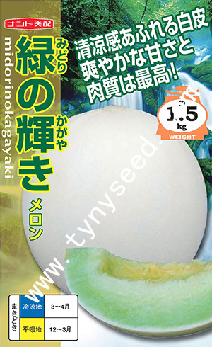 特征特性:非常香的独特清凉感的绿色肉甜瓜。果肉颜色鲜艳的绿色,其糖度预计在16 ~ 17度。夏天的甜点是相匹配的。果皮颜色是纯白色,咬,香果肉具有有味道的瞬间。尺寸为1.4 ~ 1.8公斤左右和带。果形高球形。