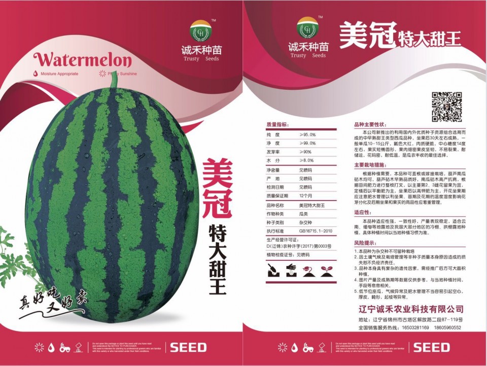 本公司新推出的利用国内外优质种子资源组合选育而成的中早熟甜王类型西瓜品种,坐果后30天左右成熟,一般单瓜10-15公斤,瓤色大红,肉质硬脆,中心糖度14度左右,果实短椭圆形,果肉细密果皮坚韧,不易裂果,耐储运,花码密,耐低温,是瓜农丰收的最佳选择,