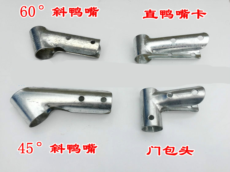 温室大棚配件鸭嘴卡又叫鸭嘴箍,它的鸭嘴片是用 镀锌带板压制而成,规格多种多样。大棚配件鸭嘴夹在大棚建造中主要起到管与管之间的固定作用,是温室大棚建造过程中配件之一。鸭嘴卡是用于农业温室大棚的连接,厚度0.7-1.5mm左右,具有使用寿命长和易于安装等作用。广泛适用于大棚建设,蔬菜大棚建设,日光温室大棚,养猪大棚建设,塑料大棚建设,养鸡大棚建设,温室大棚配件,连栋大棚配件,钢架大棚配件,蔬菜大棚配件,塑料大棚配件